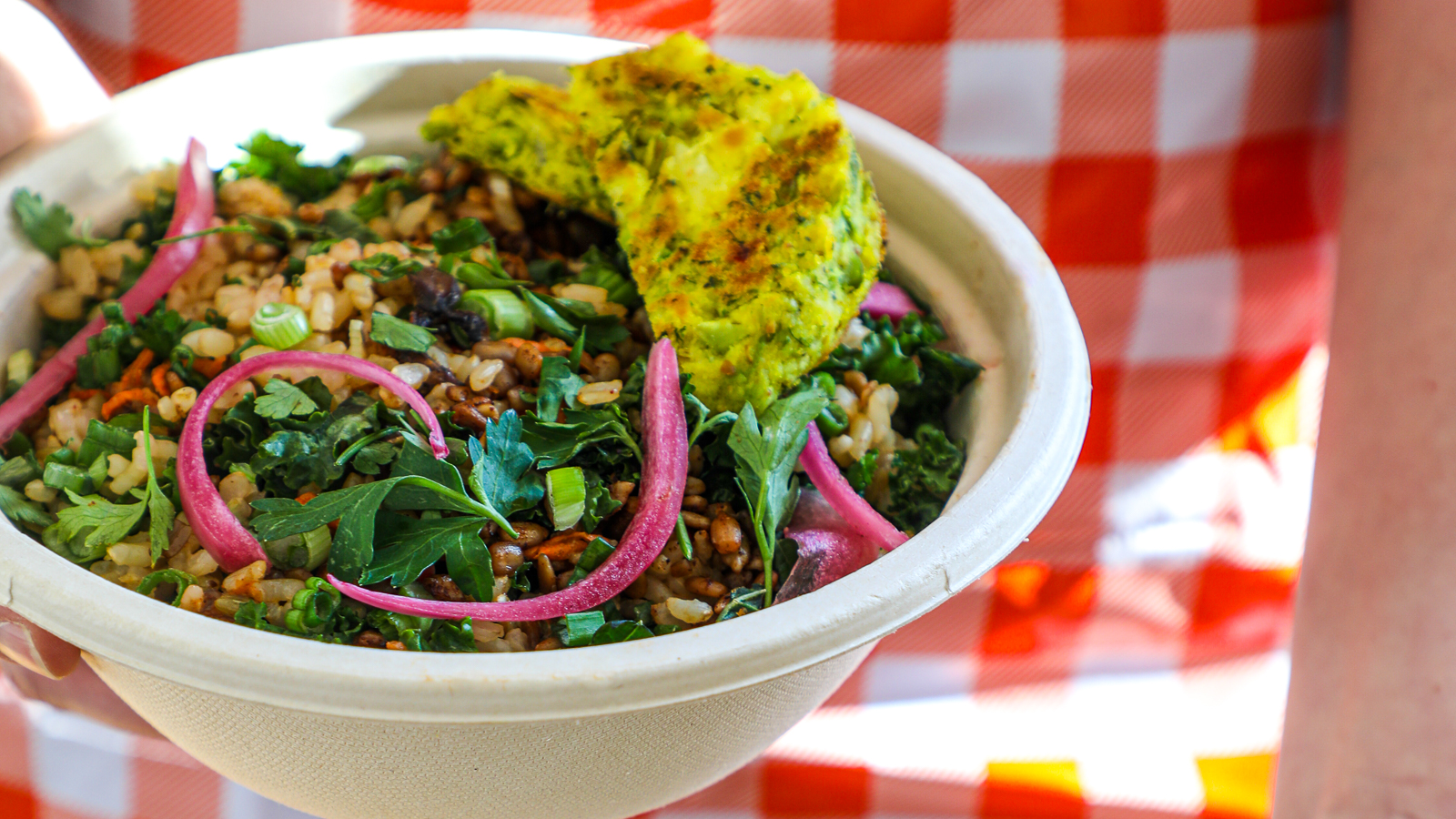 CURRY / Savoury rice, kale, tomato, radish, spicy chickpea, raisins, cilantro, lemon tahini dressing, coconut flakes, curry vinaigrette