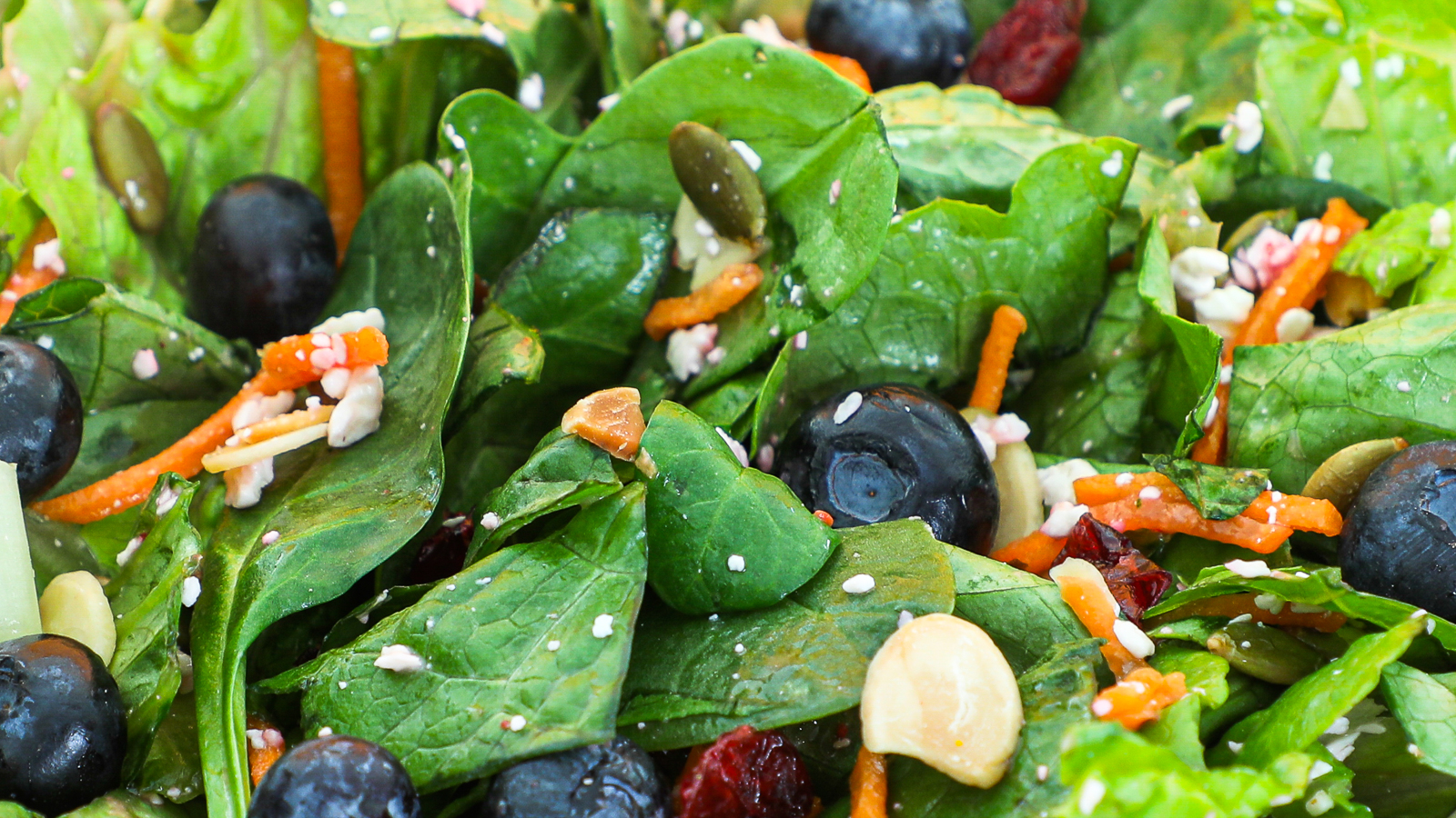 FARMBERRY / Spinach, romaine, carrot, cranberries, blueberries, almonds, pumpkin seeds, feta, raspberry poppyseed vinaigrette